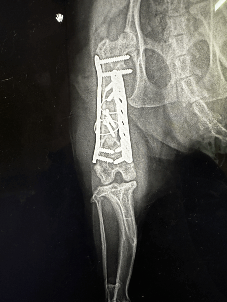 特に猫の大腿骨骨折は プレートやピンなどの整形外科用のインプラントを使った手術 が必須となることが多く、ただ包帯やギプスで固定するだけではまず治りません。
